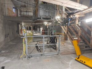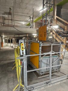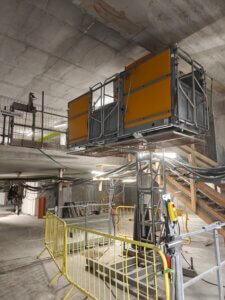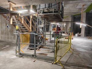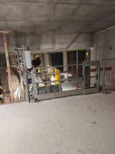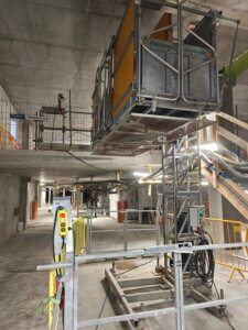 Dette hejs gjorde det muligt at transportere materialer som gipsplader, stålprofiler og tunge byggematerialer ubesværet mellem kælderetagerne. Platformens størrelse og løftekapacitet sikrede, at selv de tungeste og mest pladskrævende materialer kunne flyttes effektivt til de ønskede arbejdsstationer, hvilket reducerede spildtid og optimerede arbejdsgangen på byggepladsen.