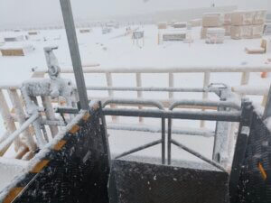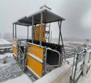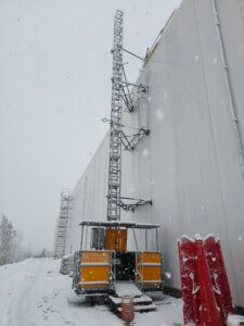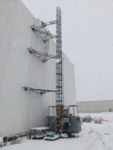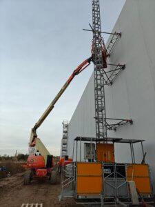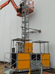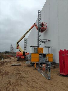 I forbindelse med opførelsen af Ro-Co’s nye halbyggeri i Frederikssund stod De Fries & Mejdahl over for en særlig udfordring: Der skulle etableres en hejseløsning til at transportere både håndværkere og materialer op til taget, men de 12 meter høje betonelementer måtte ikke gennembrydes eller fastgøres i, da de leveres indfarvede direkte fra fabrikken.