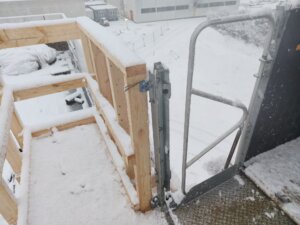 For at imødekomme denne udfordring udviklede vi en specialdesignet forankringsløsning. Fastgørelsen blev placeret på bagsiden af facaden, mens beskyttelsesgummi på forsiden forhindrede mærker og skader på de sarte betonelementer. Derudover blev der på taget konstrueret en skræddersyet trærampe, da brystningen var for tynd til at understøtte placeringen af en standardlåge.